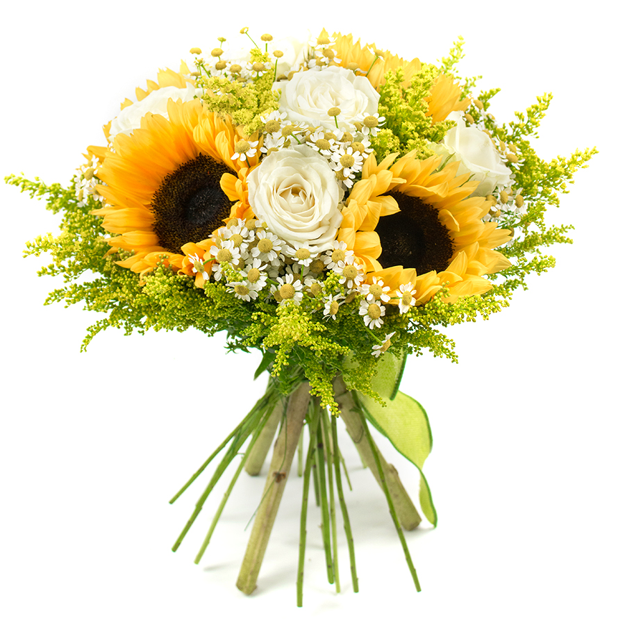 Share the splendid beauty of our Golden Harmony Bouquet. This unique floral arrangement combines vibrant sunflowers, elegant roses, delicate chamomile, and lively solidago, creating a harmonious and visually stunning bouquet.